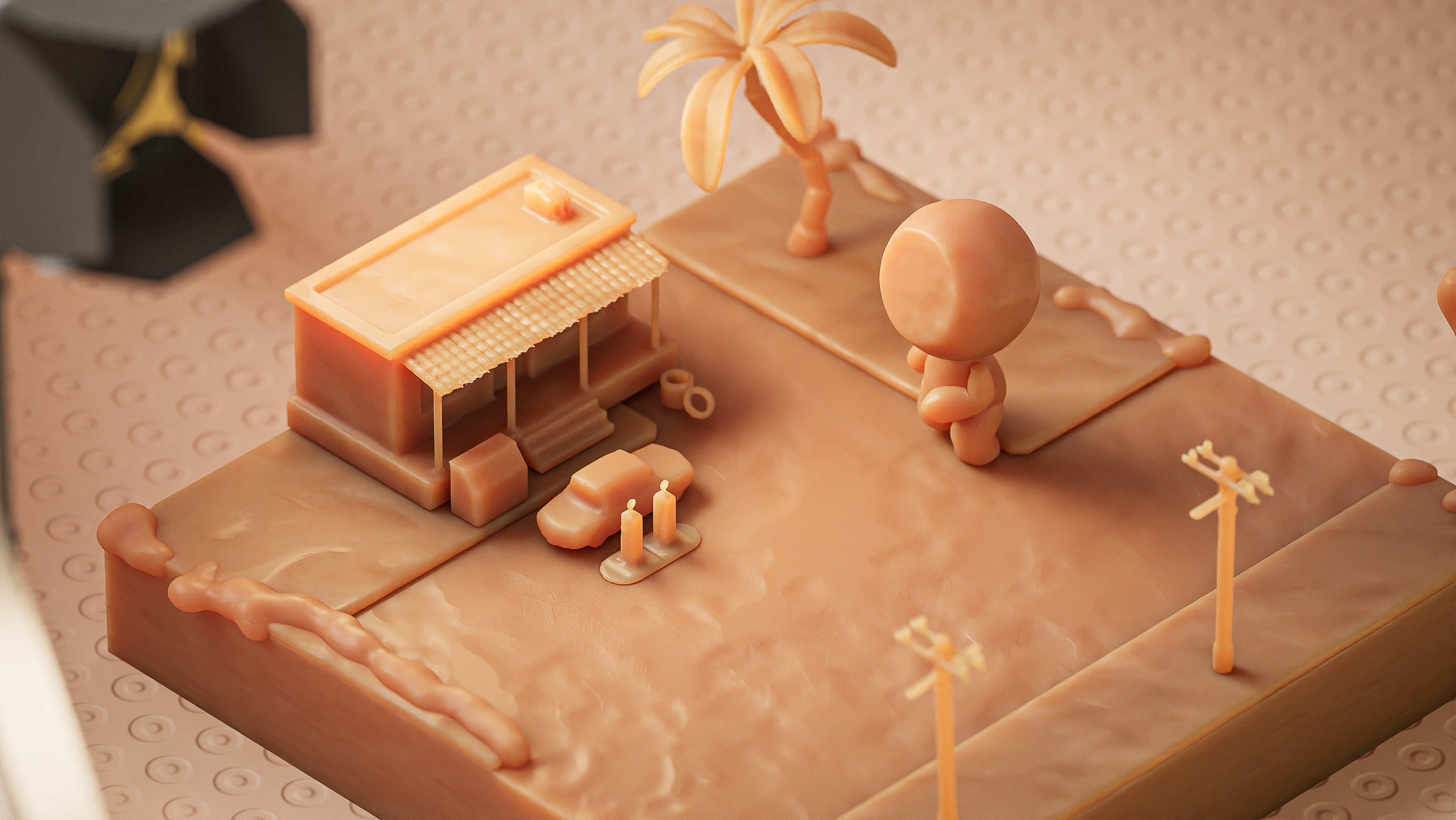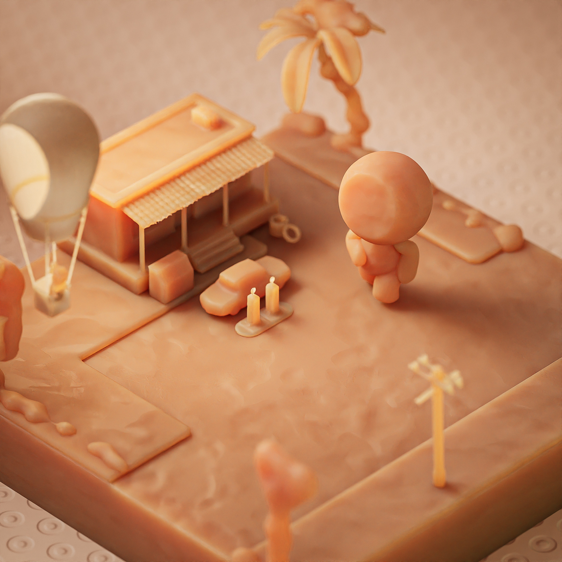 Models were mostly from the 3D Asset store - voxelized and run through TyFlow in 3DsMax to give it that blobby clay look.