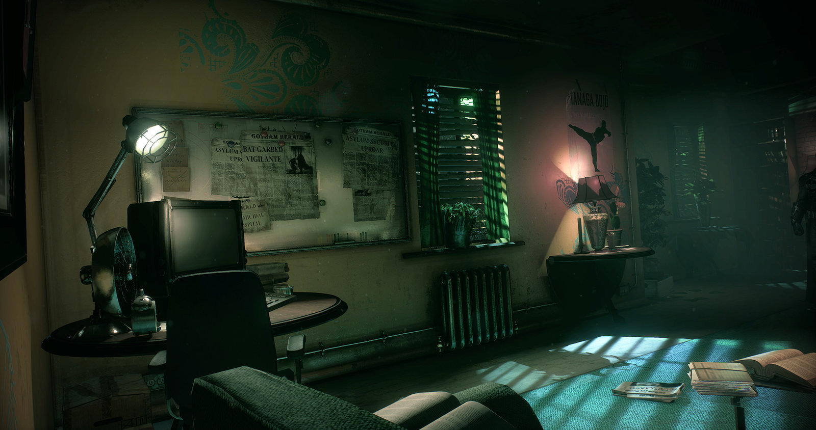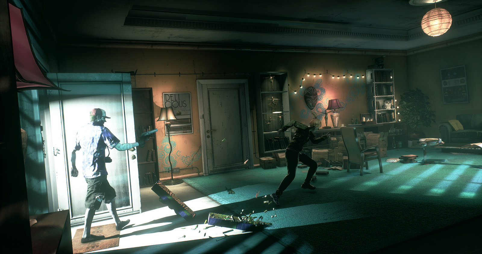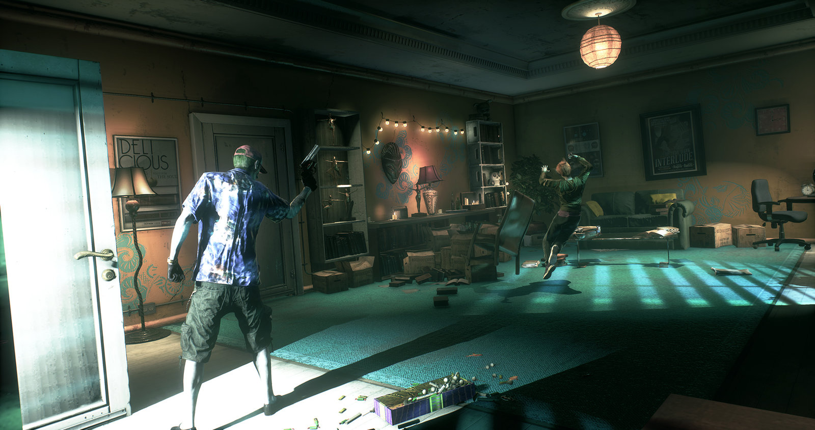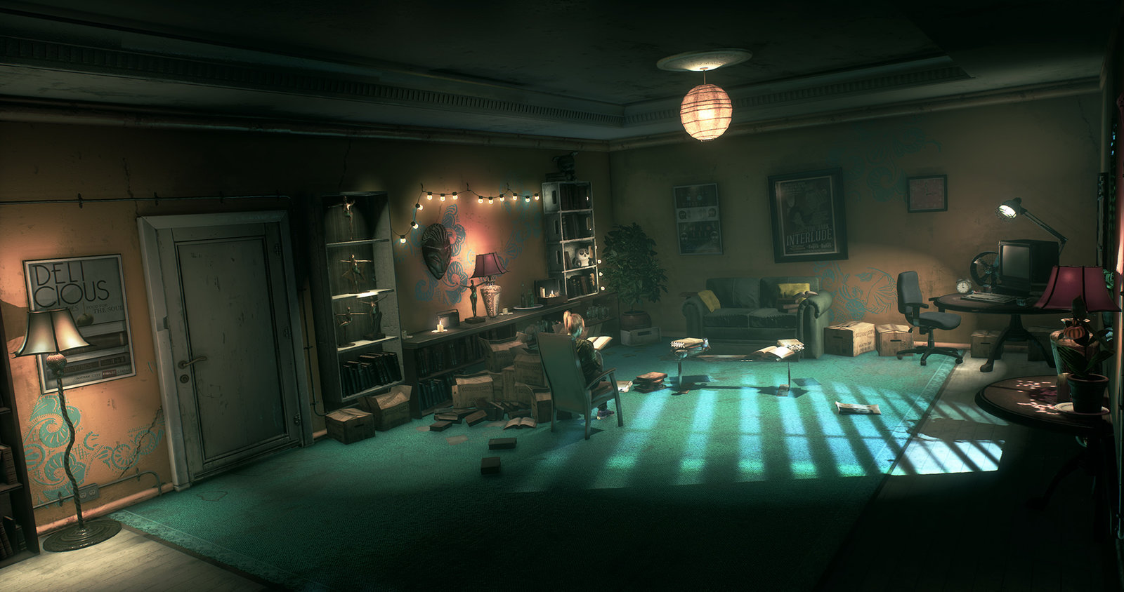 One of the trickier aspects of this room was the hallucination transition back into the present day as the whole room had to fit within the Clocktower, as well as have seamless lighting and reflections when transitioning. Cinematics, design, character guys and animation did a lovely job on this one and it was a group effort. A lot of the smaller props were from other artists on the team, the great posters were done by Markus Lovadina and Simon Brewer.