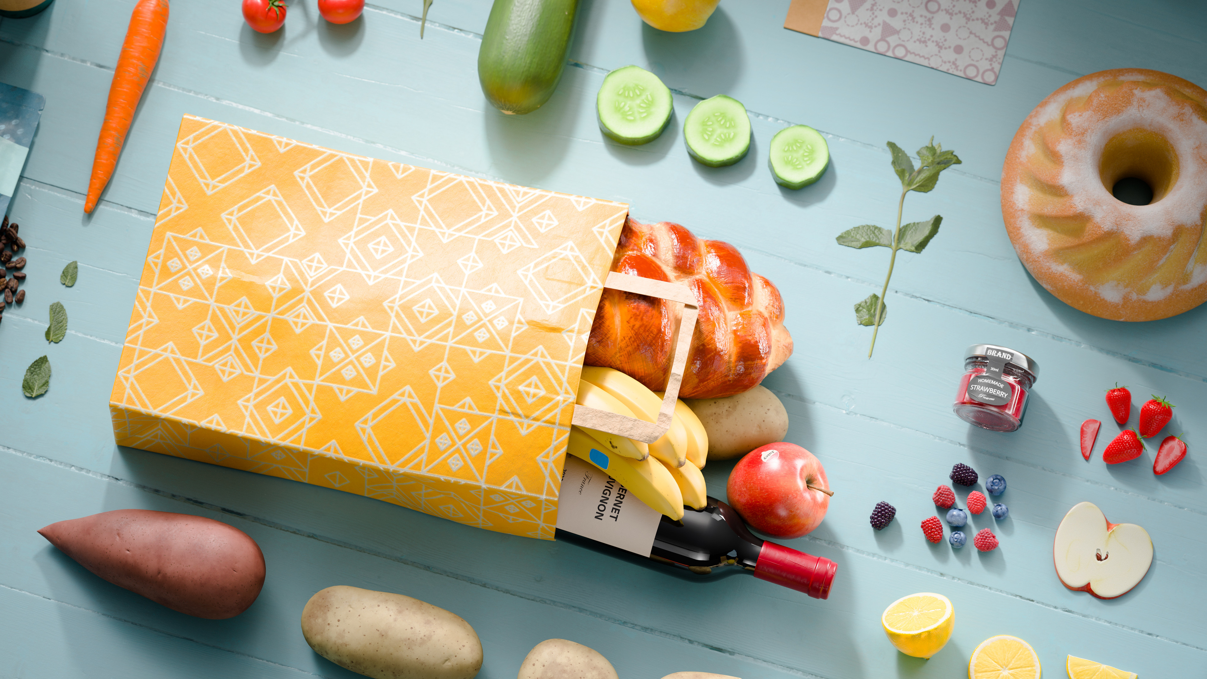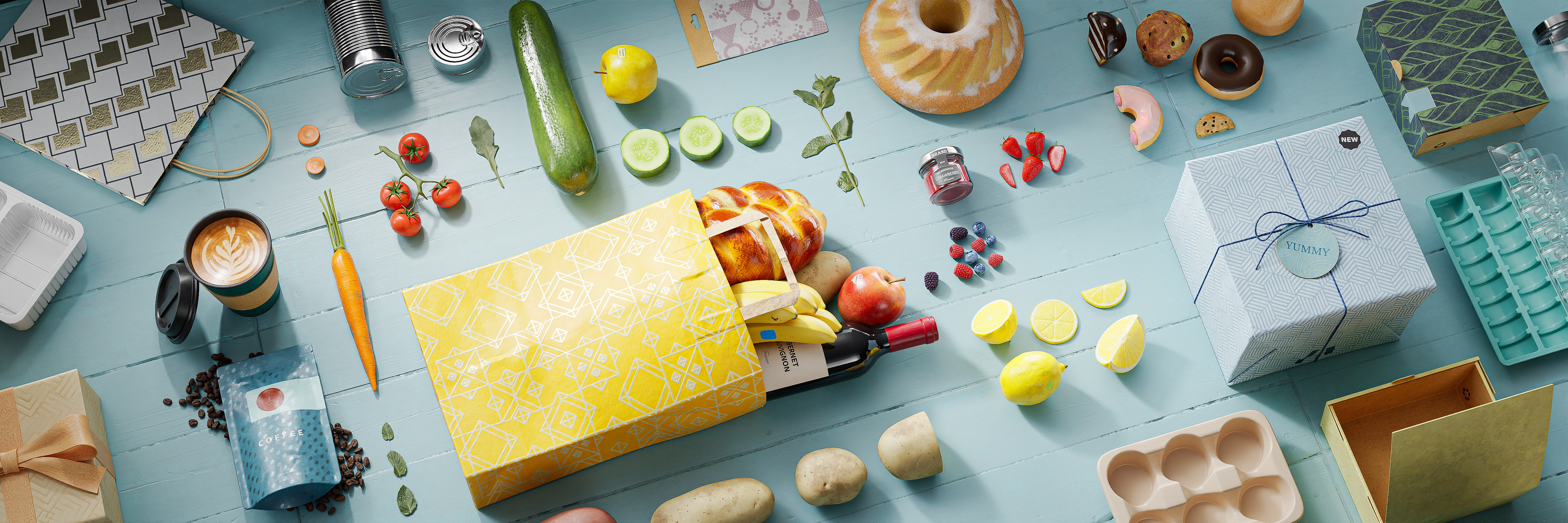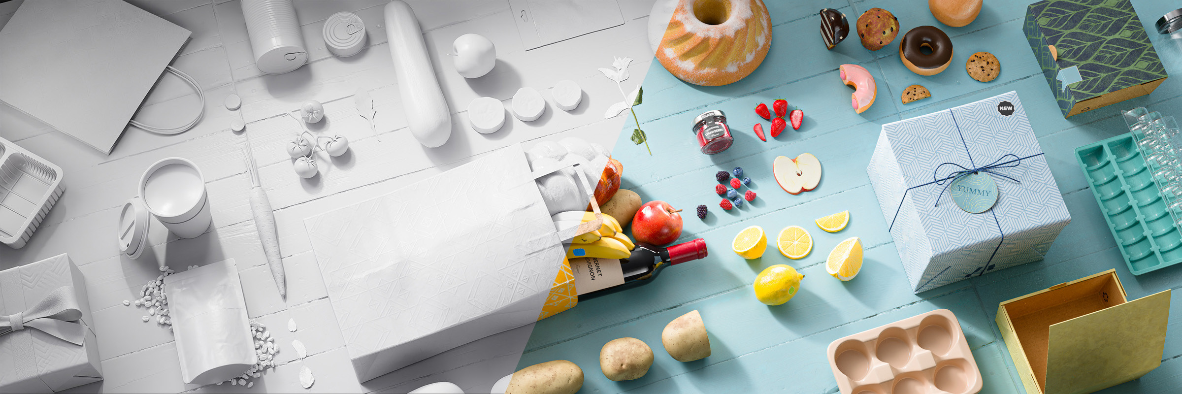 Design the Delicious - a showcase of the Substance 3D Assets Food Packaging Collection.
